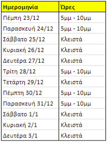 Την εβδομάδα των Χριστουγέννων και της Πρωτοχρονιάς, το κατάστημα μας θα λειτουργήσει: