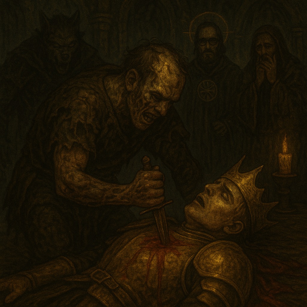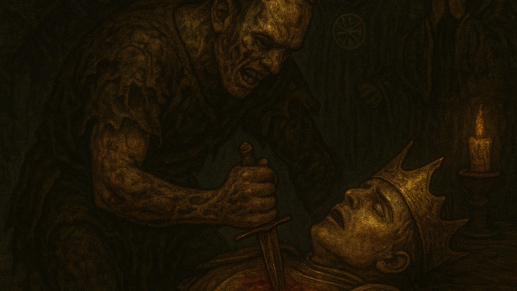 He drives a blade into the knight’s chest — not out of rage, not even out of madness — but calculated necessity.