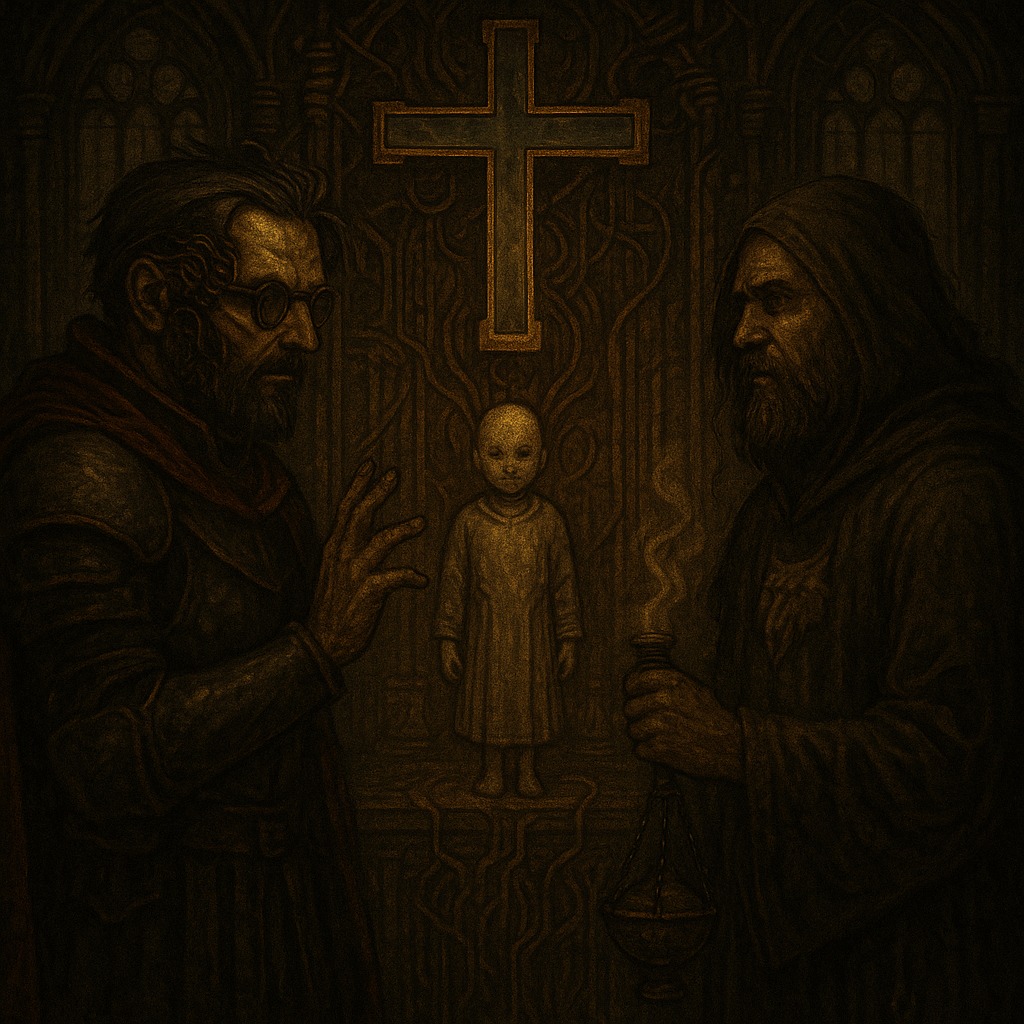The room responds — walls grow thorns of wire, bleeding data and psalms. The trial’s core emerges: a childlike figure, blank-faced, held in stasis between two altars.