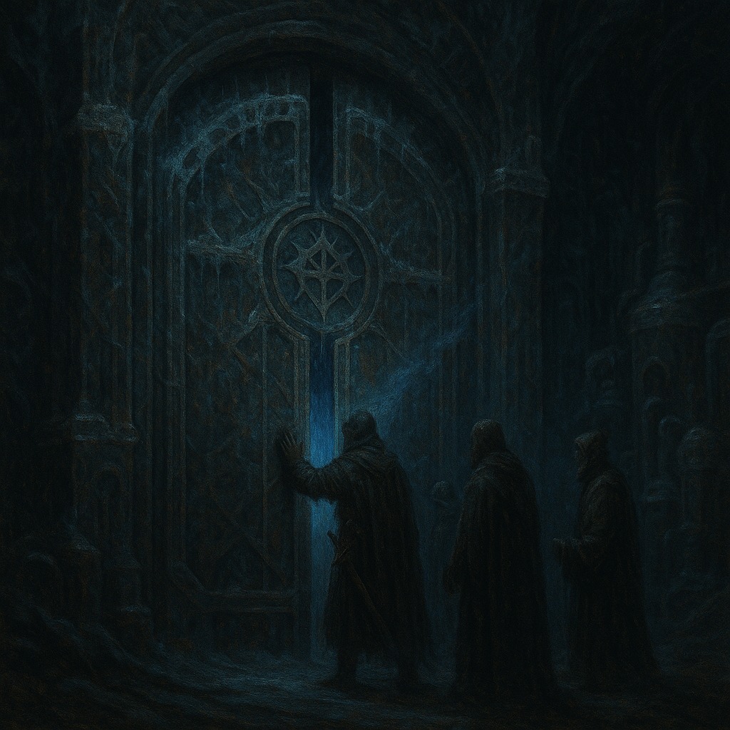 The enormous gate is carved from blackstone and brass, overgrown with frost. On its center: an ancient sigil — the sigil of Aetharion — cracked but unmistakable. As the group approaches, it shifts, reacting to their presence. Ice retreats. Metal groans.