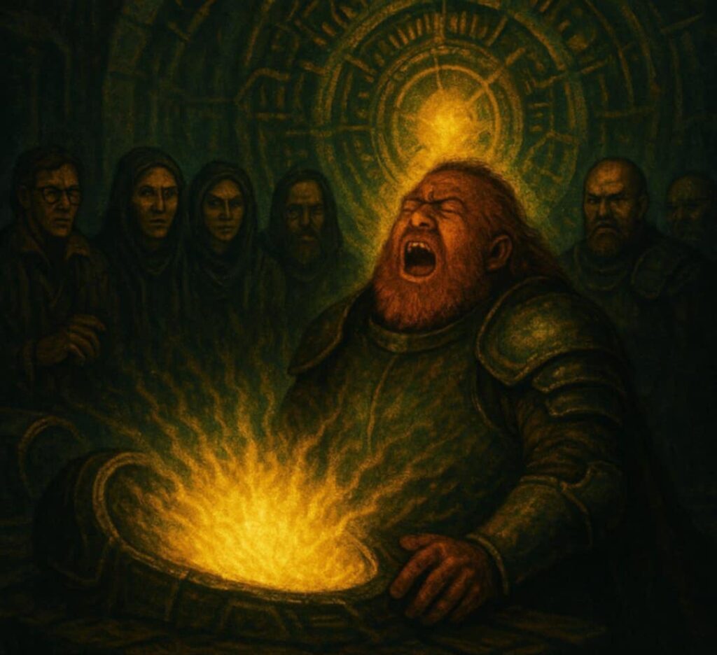 Gleg hurls a bottle of flaming ale, which explodes midair — a burst of alchemical fire stalling Veltharion’s advance.