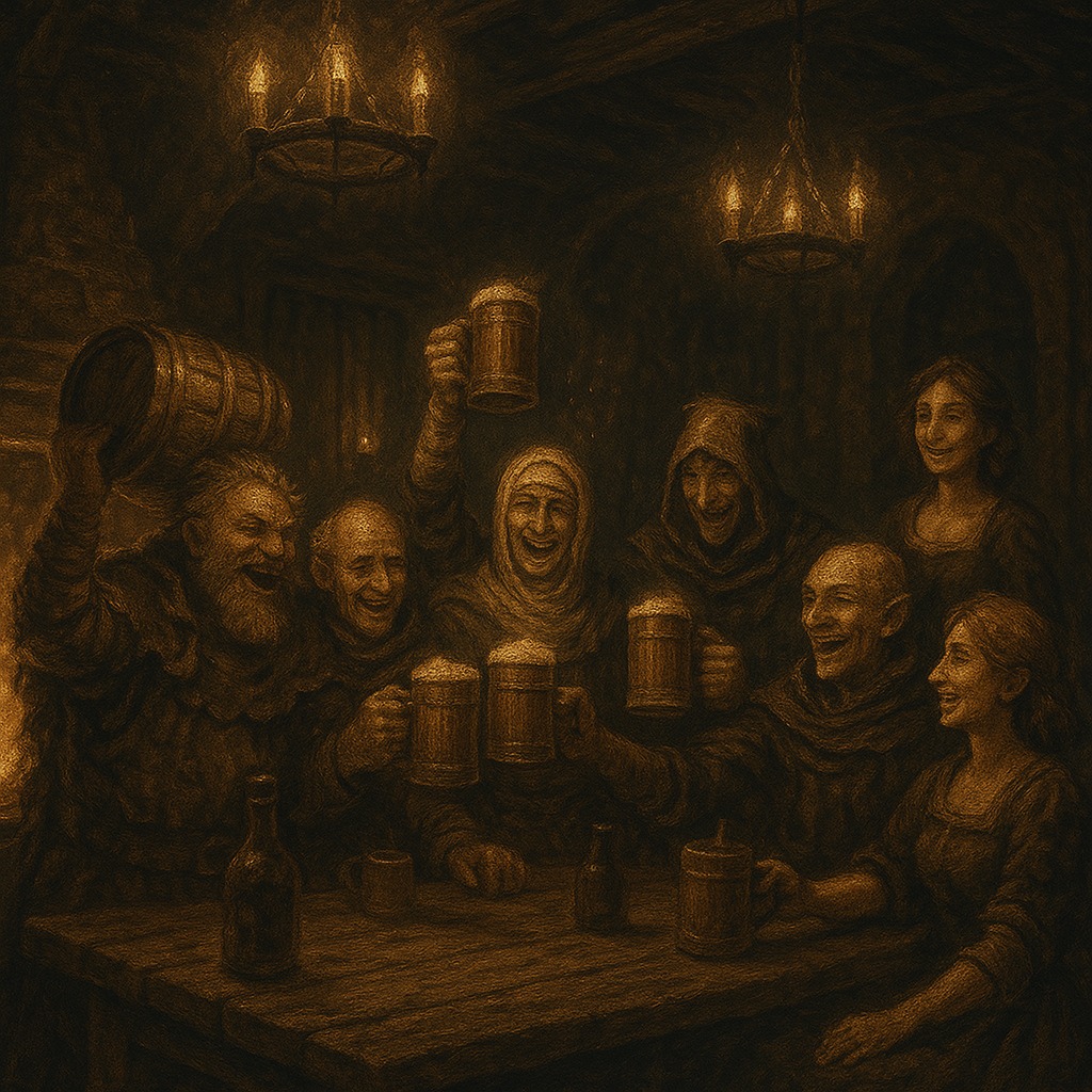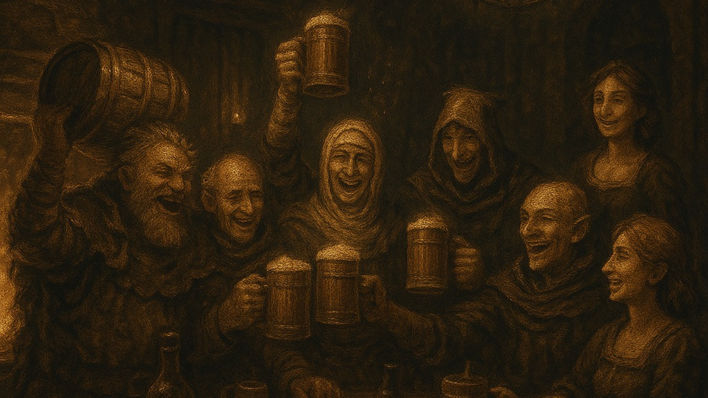 The mugs clash together. Foam spills. Laughter echoes off the old wood beams.