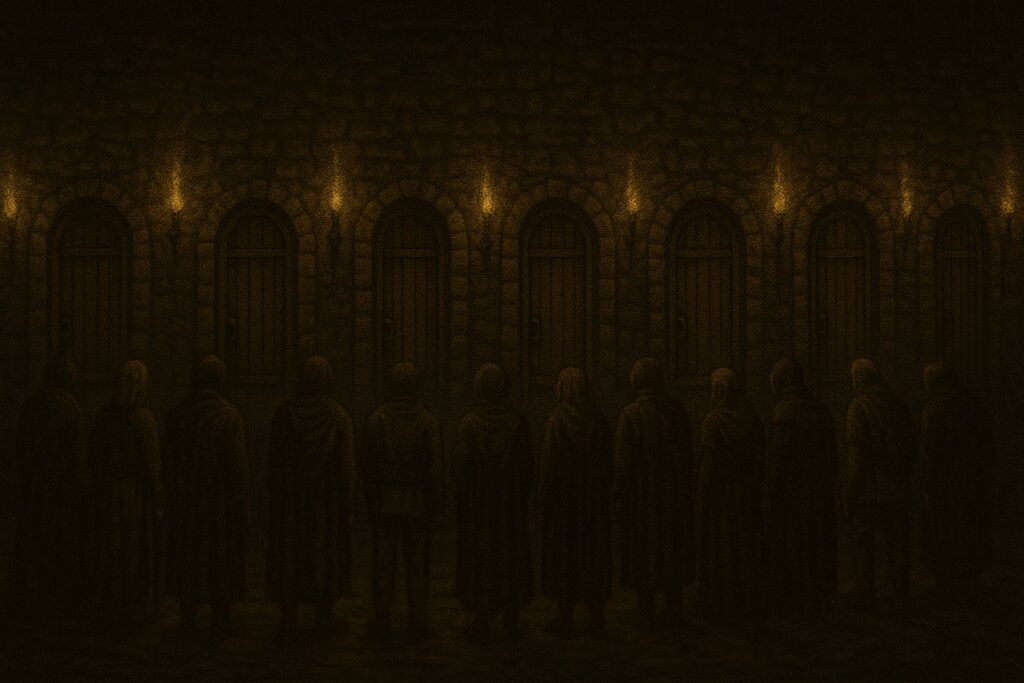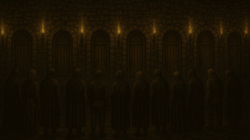 A row of ten identical doors appeared in the far wall, smooth and black like polished obsidian. Each bore no handle — only a small carving in the shape of an eye.