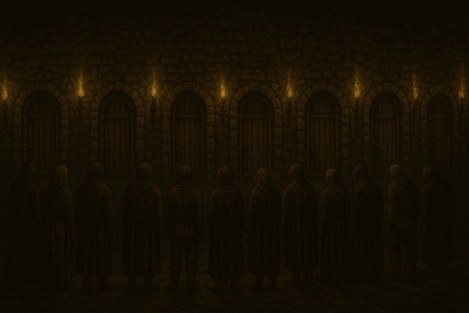 A row of ten identical doors appeared in the far wall, smooth and black like polished obsidian. Each bore no handle — only a small carving in the shape of an eye.