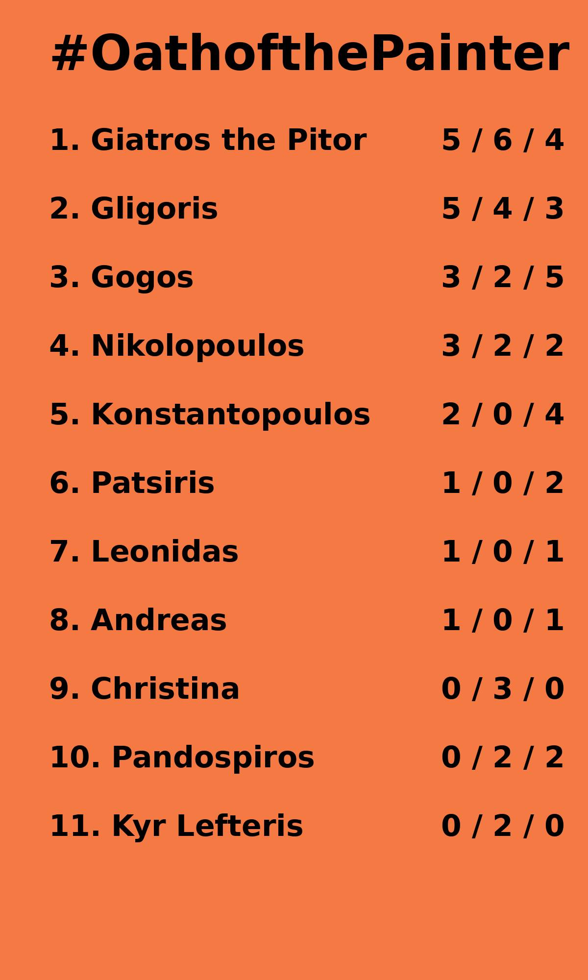 Θερμά συγχαρητήρια σε όλους, όποια και αν είναι η συνεισφορά σας. Παρακάτω έχουμε τους #oathofthepainter league winners so far αλλά και το hall of fame με τις πρωτιές για να έχουμε μια εικόνα ποιος έχει ανέβει πολλές φορές στο βάθρο.