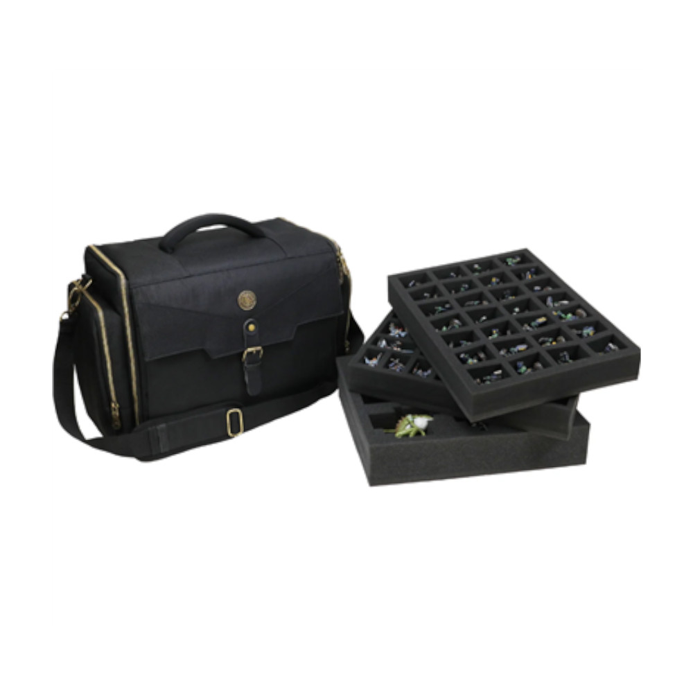 The bag is reinforced with thick padded walls that protect your miniatures from drops, impacts, scratches and from the elements. The exterior is a high quality nylon fabric with a rugged texture that looks professional with the brass metal hardware and zippers. The base of the bag is lined with a water resistant material that prevents moisture from seeping into your bag when placed on damp or wet surfaces.”