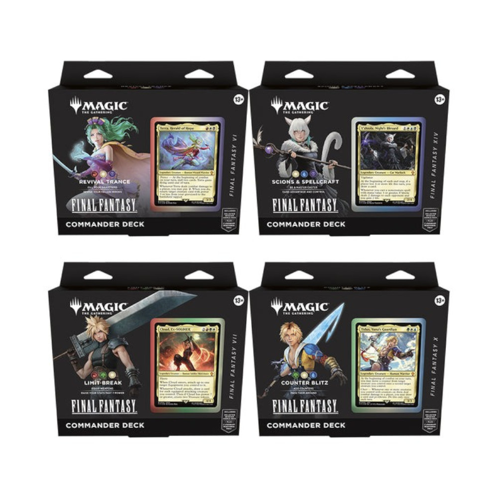 Ζήσε την επική σύγκρουση σε μορφή Commander με τέσσερα εξατομικευμένα deck εμπνευσμένα από αγαπημένα Final Fantasy παιχνίδια: Final Fantasy VI (Revival Trance), VII (Limit Break), X (Counter Blitz) και XIV (Scions & Spellcraft)