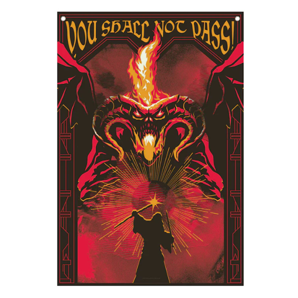 ‘You shall not pass!’ Designed from the perspective of the rings fellowship, the legendary battle between Gandalf and The Balrog is captured on this large wall banner. Each banner measures 125 x 85cm and includes metal eyelets for easy hanging making them an effective way to personalise your space.