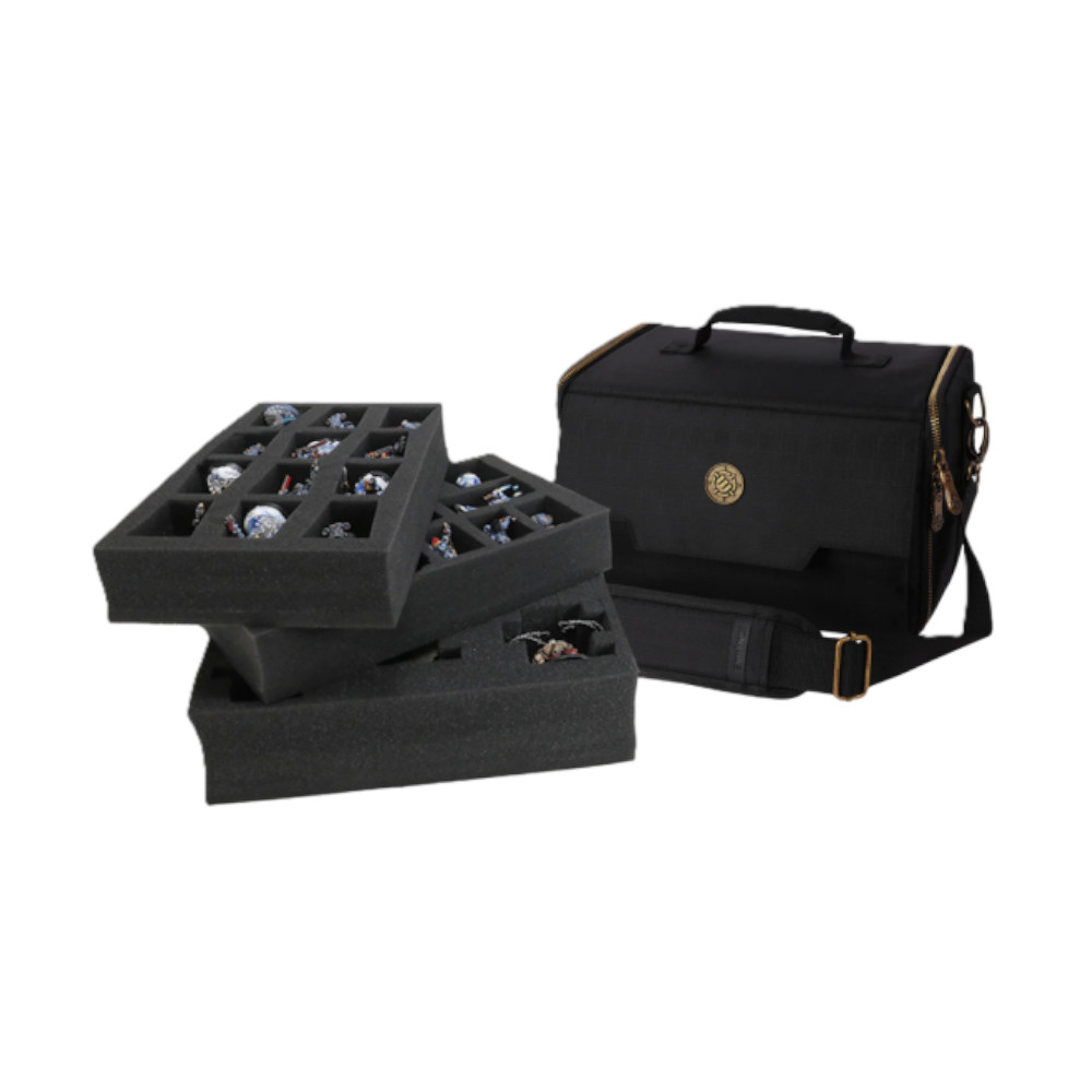 Keep your favorite party of heroes, villains, and monsters ready for action in this compact miniature figure carrying bag. It features 3 foam trays to securely store and protect your miniatures: one 12-slot tray for wide base minis, another 13 slot tray for wide base minis with different slot sizes, and a 60mm thick customizable pick & pluck tray for larger or irregular models/tanks. The bag’s padded walls provide extra protection from drops, scratches, and the elements. The exterior is made of a high quality nylon fabric with a rugged texture and features brass metal hardware and zippers. The versatile shoulder strap allows you to carry the bag comfortably and conveniently. Whether you’re heading to a dungeon crawl, a skirmish battle, or a role-playing session, you’ll always have your favorite characters and creatures at hand with the ENHANCE Wide Base Mini Satchel. It’s more than just a bag…it’s a portable showcase of your epic adventures and memorable encounters.