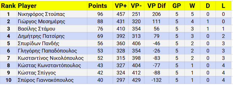 Με την πέμπτη αγωνιστική πλέον ολοκληρωμένη, και τους Νικηφόρο και Γώγο μοναδικούς αήττητους, η βαθμολογία της λίγκας μας έχει διαμορφωθεί: