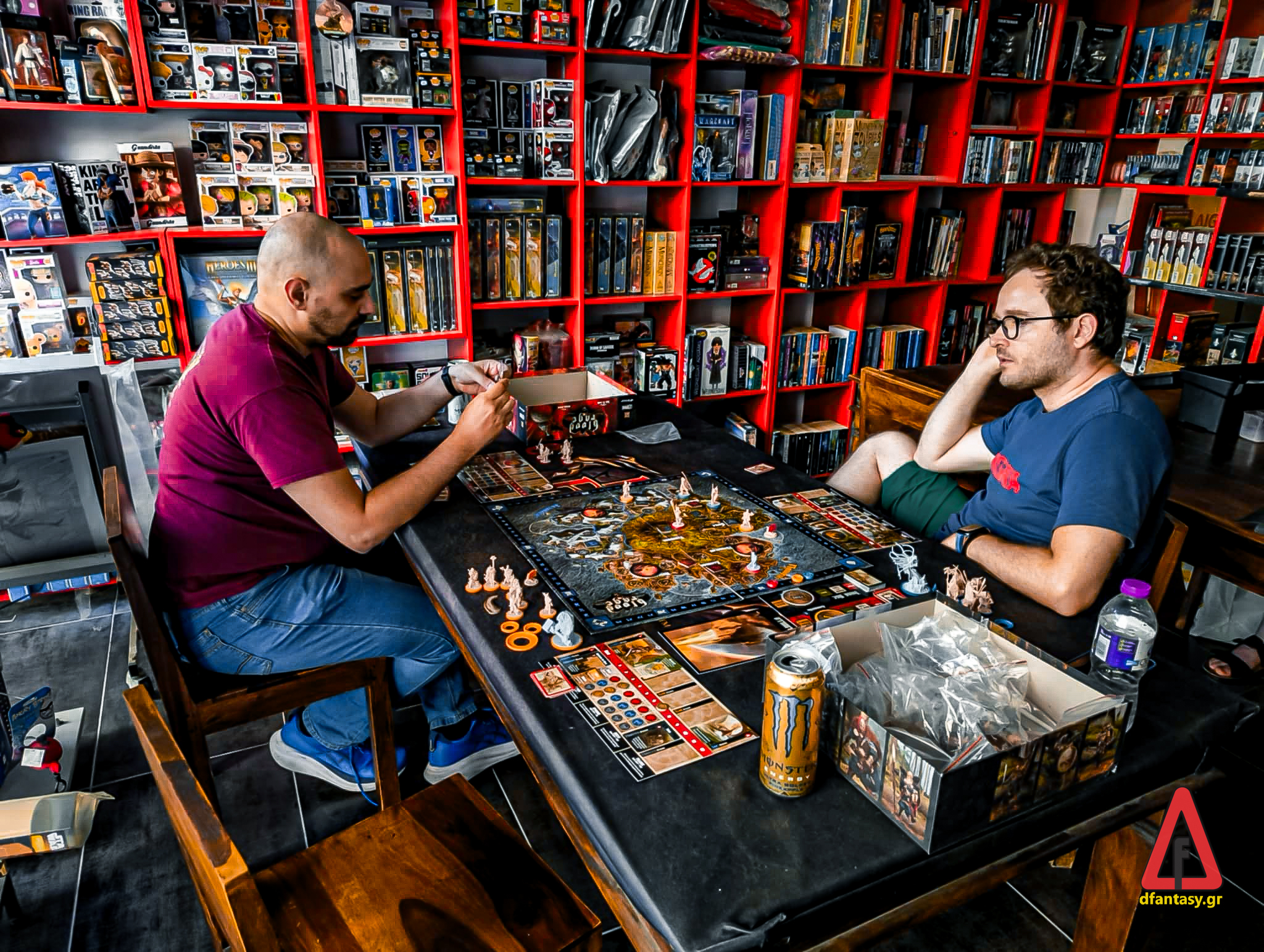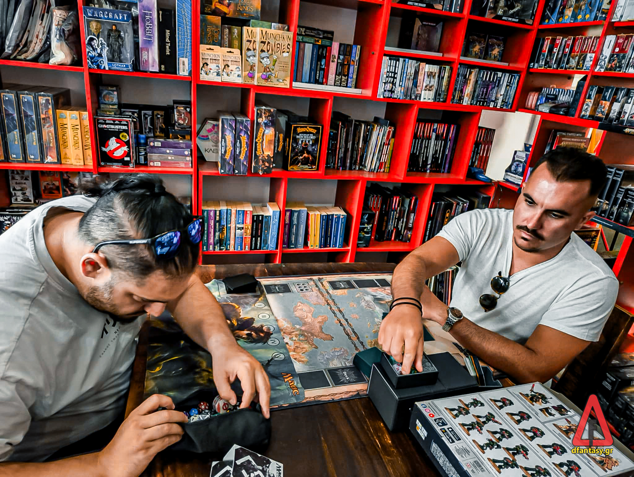 Στο βάθος, οι πιτόροι σκυμμένοι πάνω από μινιατούρες, ακούγοντας lo-fi σαν να είναι σε στούντιο τατουάζ. Στο ισόγειο, η λίγκα του Warhammer φτάνει στα όριά της — με ζαριές που αφήνουν σκιές στον τοίχο και βλέμματα που μετρούν τις αποστάσεις πιο σοβαρά κι από γεωμέτρη. Ο Gaslord Νικολό ρίχνει το τελευταίο του glance στο board, κι ο Κουμπάρος — μικρό φαβορί — κάθεται πίσω, με Fanta και φιλοσοφία ήττας.